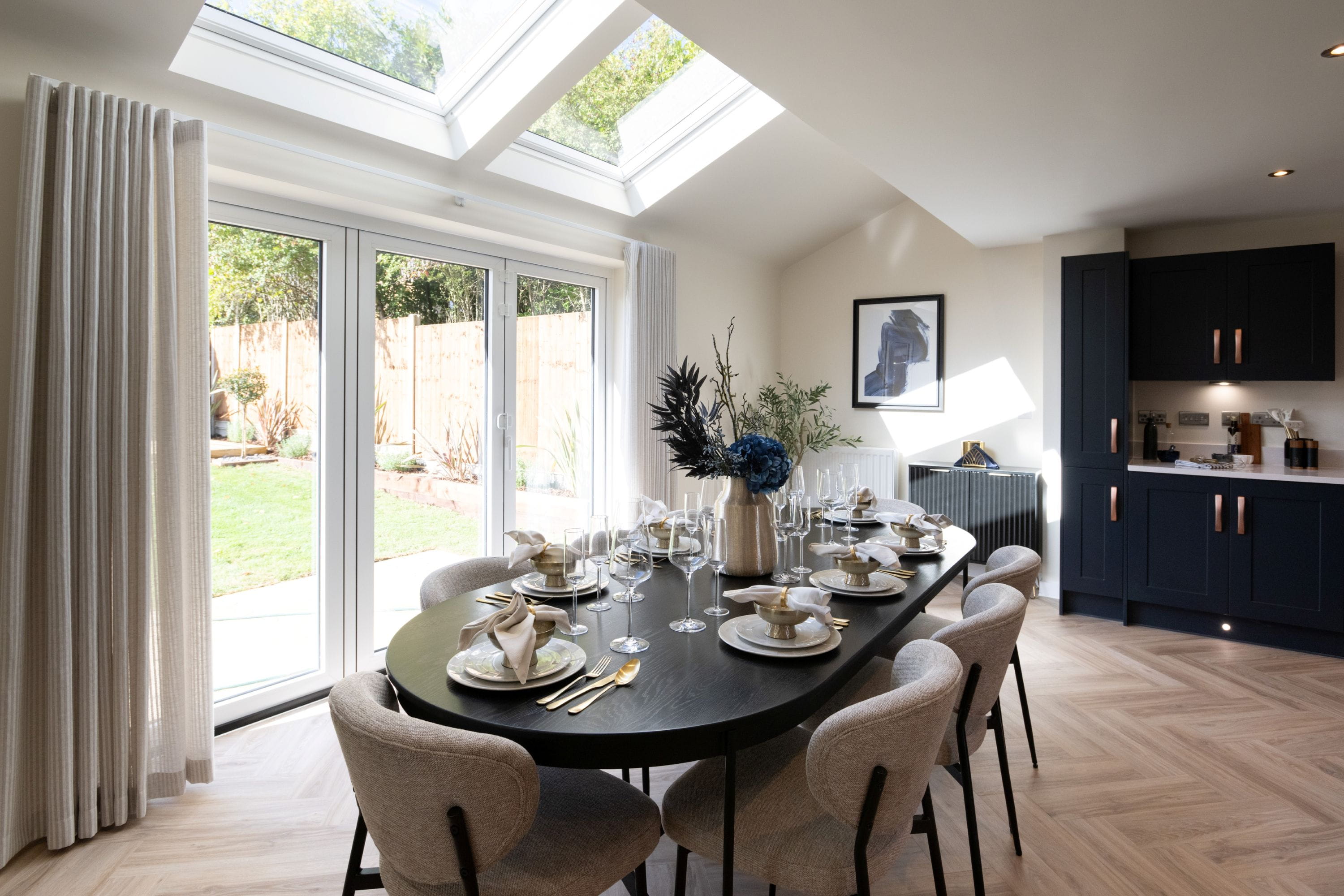 Designed to be the heart of the home, the kitchen boasts a central island, ideal for casual dining or socialising while cooking. Roof lights and bi-fold doors further elevate the space, creating a bright and airy environment that seamlessly connects indoor and outdoor living. The adjoining dining room, complete with French doors, provides a more formal setting for family meals or entertaining guests, offering flexibility for different occasions.