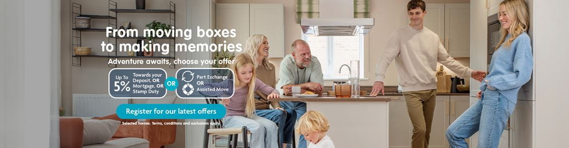Adventure awaits in your brand-new home! At Miller Homes, we’re here to turn your ‘one day’ dreams into ‘right now’ reality. On selected homes you can choose from up to 5% towards your mortgage, deposit, or Stamp Duty*, or benefit from our Part Exchange† and Assisted Move^ options, meaning your new adventure is closer than you think. So, get moving. Pre-reserve your new home online today. Terms and conditions apply.