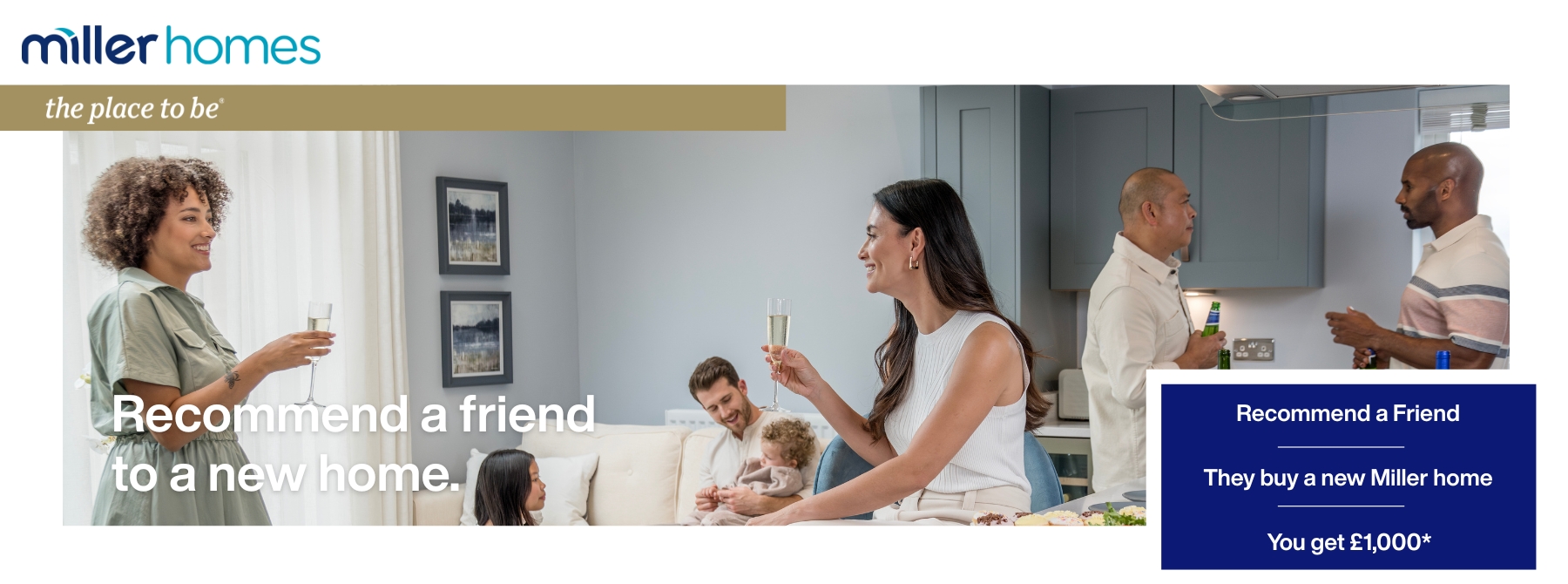 *To claim your reward this voucher must be completed in full, signed by all parties and handed to the Development Sales Manager on the initial visit. £1,000 will be paid to the referrer only upon legal completion of the homebuyer’s purchase. In the event of the completion not taking place due to either party pulling out for any reason the £1,000 payment will not be honoured. Please allow four weeks after the completion date for receipt of the monies. Only one Recommend a Friend voucher can be used per home purchase. Subject to Miller Homes’ standard terms and conditions. This scheme is available to UK residents only, aged 18+. The scheme is not available to employees of Miller Homes, any person connected or related to such employee. Miller Homes; agents or any person either connected professionally with this scheme or offer or acting in a business capacity. £1,000 payment is not exempt from income tax or capital gains tax. The recipient of the £1,000 are responsible for declaring and paying any tax that may be due on this payment. Recommend a Friend scheme can not be used in conjunction with any other offer. Miller Homes reserves the right to withdraw the Recommend a Friend scheme at any time. Promoter: Miller Homes Limited of Miller House, 2 Lochside View, Edinburgh Park, Edinburgh, EH12 9DH. All imagery represents a typical Miller Homes’ property.